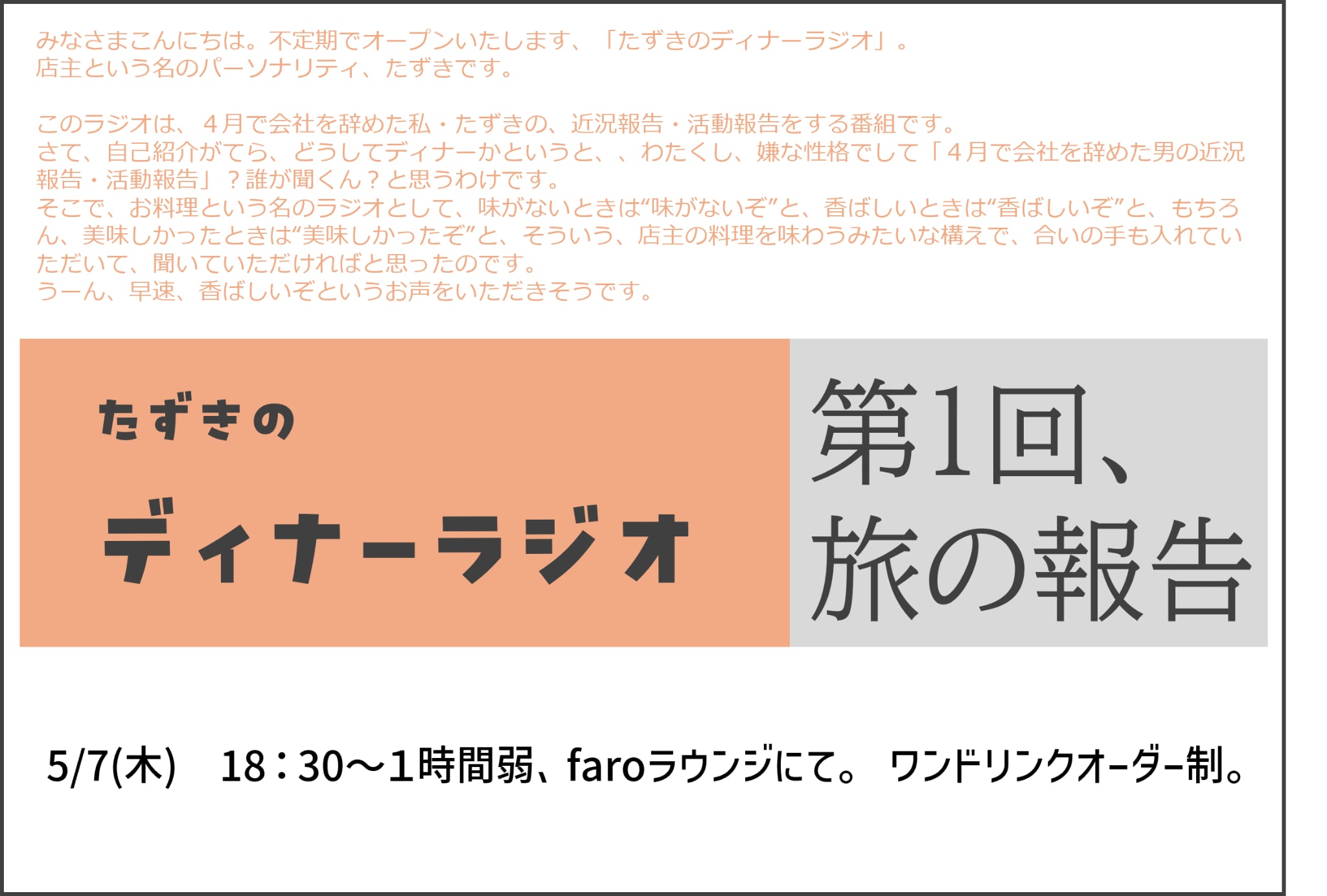 2026.04.19 Sun「たずきのディナーラジオ 第1回、旅の報告」みなさまこんにちは。不定期でオープンいたします、「たずきのディナーラジオ」。店主という名の……