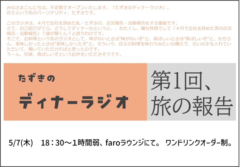 みなさまこんにちは。不定期でオープンいたします、「たずきのディナーラジオ」。